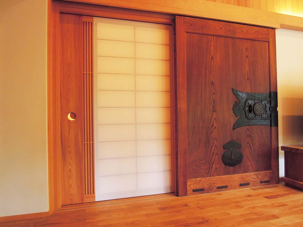 軽井沢にあるF様の別荘にテーブル、引き戸、衣装箪笥等をいくつか納品いたしました。大きな蔵の戸で作った引き戸がリビングの雰囲気を引き締めています。