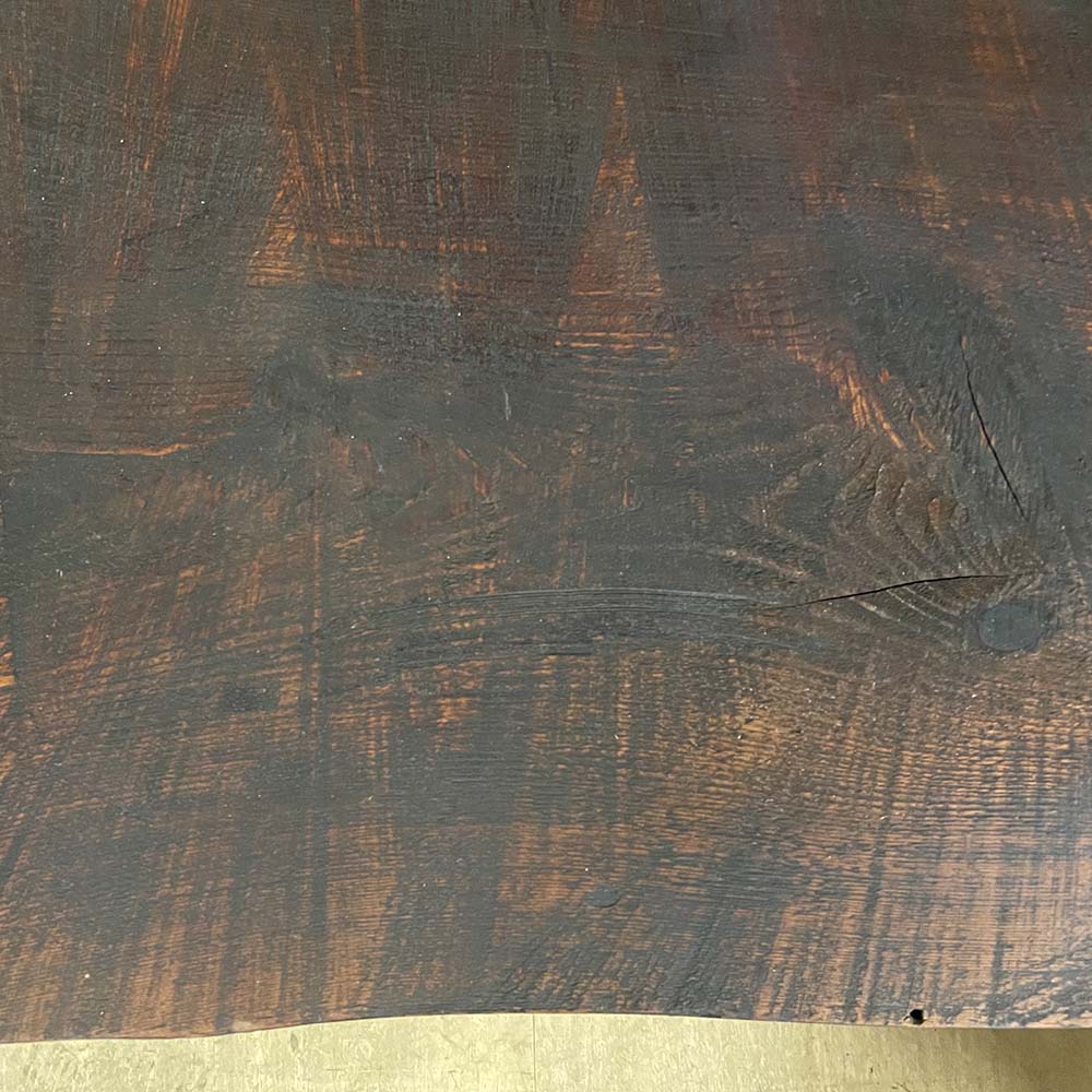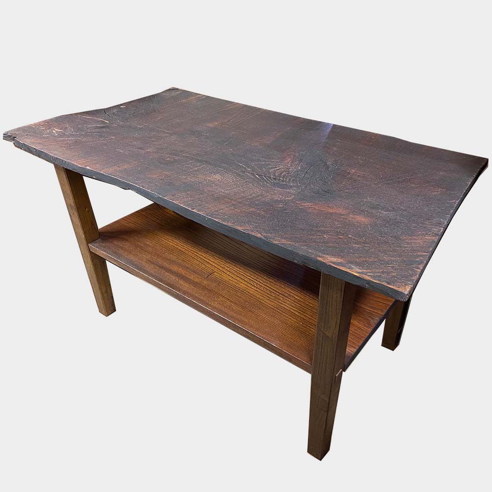 木挽きがひいた板をあえてそのまま使用して少しだけ低いテーブルにしました。今では機械でカットするのでこの様な挽いた後の板にはなりません。オリジナルの商品で一点ものになります。