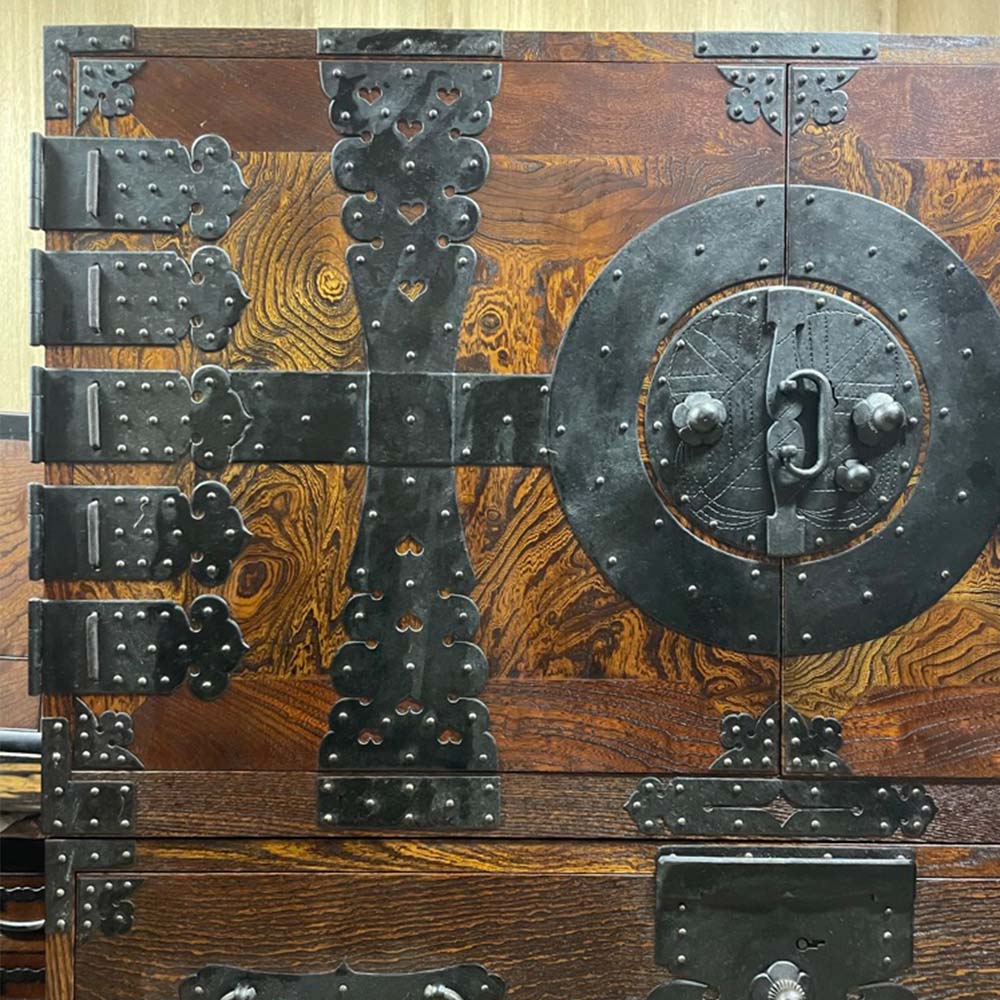 元禄箪笥とも呼ばれる武家箪笥。表をけやきに変更して仕上げました。本体は手間のかかる根来塗で江戸時代の時のそのままです。
