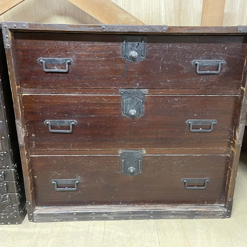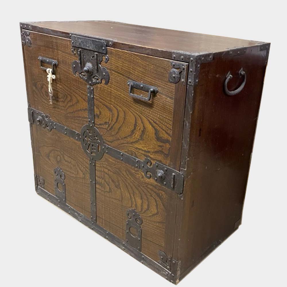 少し大きめのサイズが珍しい総けやきの漆塗りの船箪笥。古いものを修理しました。色も赤みが少なく渋い色に仕上がっています。スッキリとしたデザインが洋室にも合いそうです。