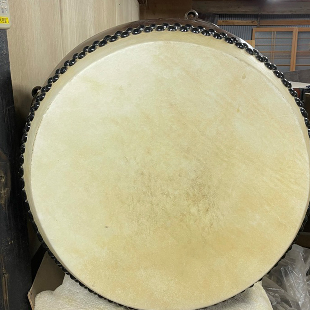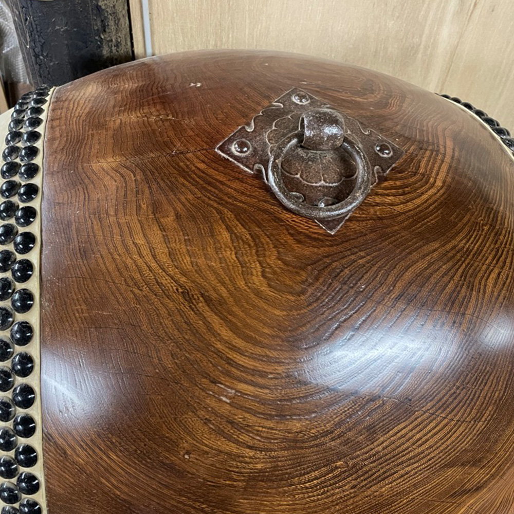 大きめのサイズの江戸時代の和太鼓。革は張り替えました。古い太鼓の特徴でもある丸みの強い胴の部分は割れもなく綺麗な状態です。新しい物だと更に内側でもう一つ太鼓を切り出すのであまり丸みを作る事ができません。こちらは贅沢な丸みのせいか、叩くとすごくいい音がします!