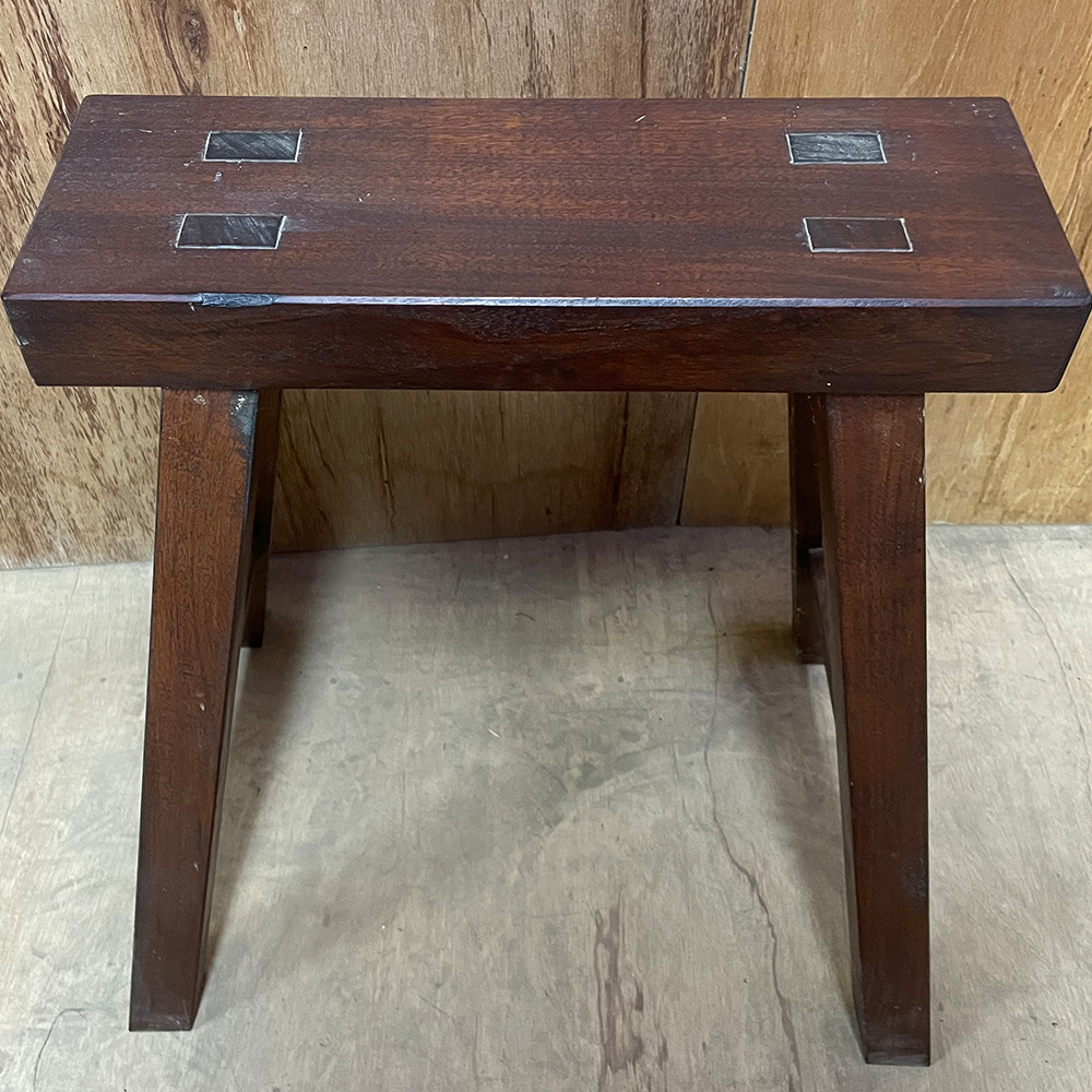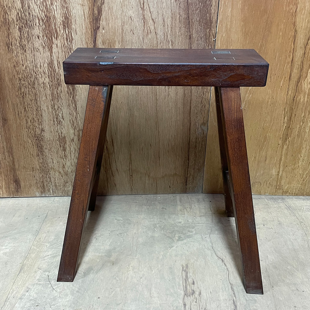 くるみの木の古材で作ったオリジナルの四角い椅子。全体的に素朴な仕上がりで小ぶりなので椅子として以外の使い方もできそうです。